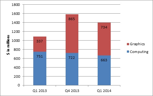 Revenue increased due to the custom chip business, which grew in the wake of Sony PlayStation 4 and Microsoft Xbox One sales. Discrete graphics also grew, due to the increasing popularity of AMD's R7 and R9 graphics cards. However, revenue growth was capped by the declining computing segment, due to negative growth in the PC market. The diagram bellows shows the changing mix of AMD's revenue and its declining reliance on the PC industry: