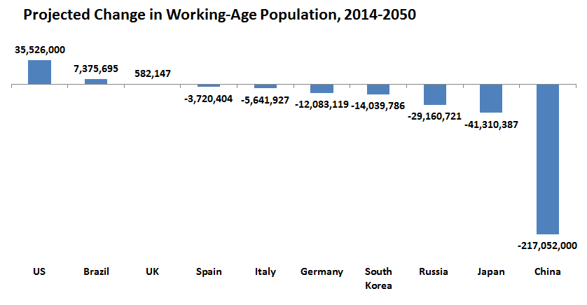 But there's so much focus today on how America's retiring baby boomers are going to hurt the economy. The truth is that not only will the U.S. add tens of millions of more workers over the coming decades, but few other countries can say the same. (India will grow its working population more, but its lower life expectancy and massive poverty tamps down this benefit). This is America's biggest edge over the rest of the world. And just as economists overlooked how devastating Japan's poor demographics would be 20 years ago, I get the feeling they're underestimating how advantageous America's will be 20 years from now.