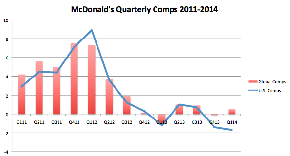 The burger giant reported that revenues rose just 1% systemwide to $6.7 billion (3% after removing currency fluctuations), but same-store sales fell 1.7% in the U.S for its third straight quarterly decline. They only managed to inch just 0.5% higher globally.