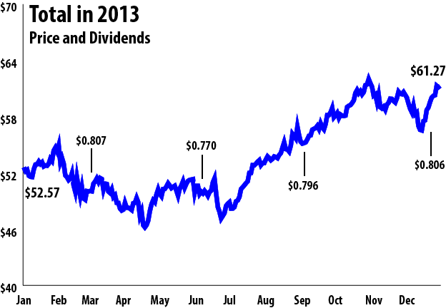 To get a feel for the effects of foreign withholding we'll consider a full-year of Total's price and dividend performance. Here's the company's story from 2013: