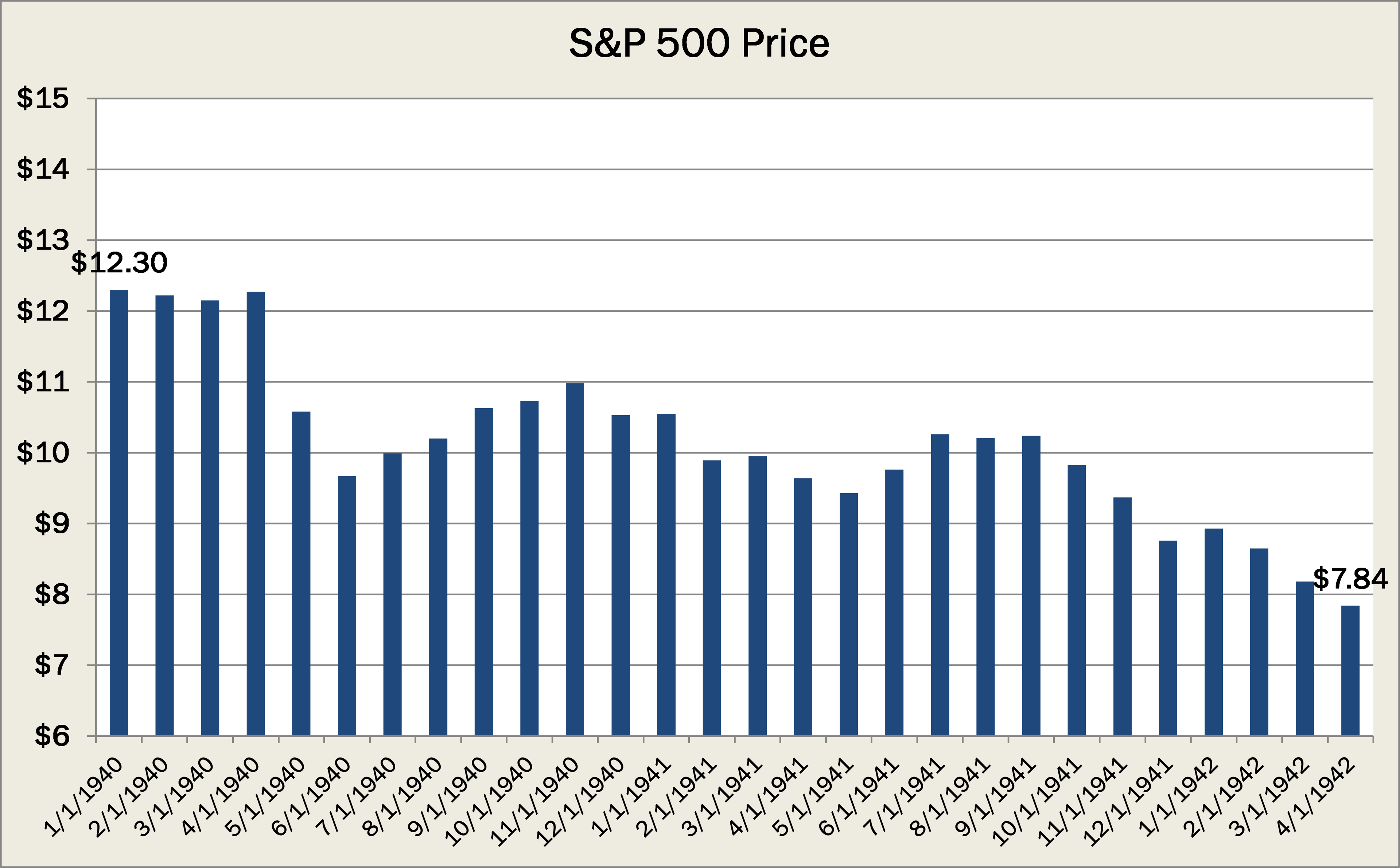 Looking back to one of the most heightened times of unrest in our nation's history, from the beginning of 1940 to April 1942 as World II began, the stock market plummeted nearly 40%, as the S&P 500 dropped from $12.30 to $7.84.