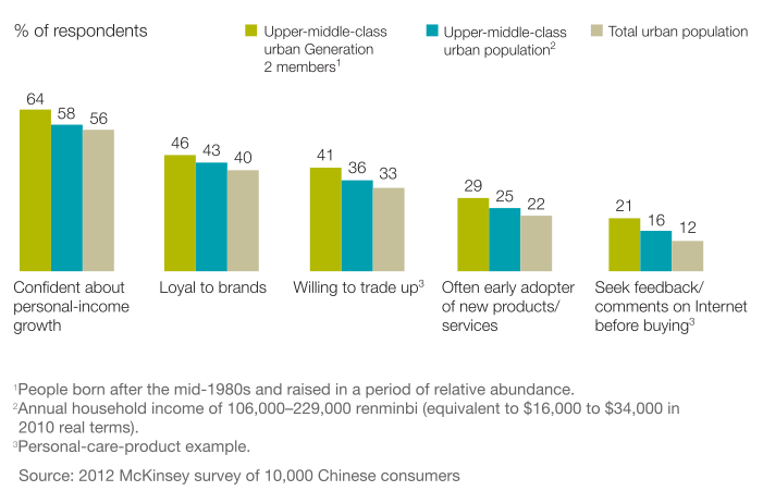 Multinational companies are starting to focus on Chinese middle-class consumers who were born after the mid-1980s and were raised in a period of relative abundance. Their parents, who suffered through years of scarcity and uncertainty, focused on saving and building economic security. Thanks to economic reform and China's government opening up to the world, saving is declining and discretionary spending is rising among this increasingly affluent generation. These consumers are ready to show their independence through consumption.