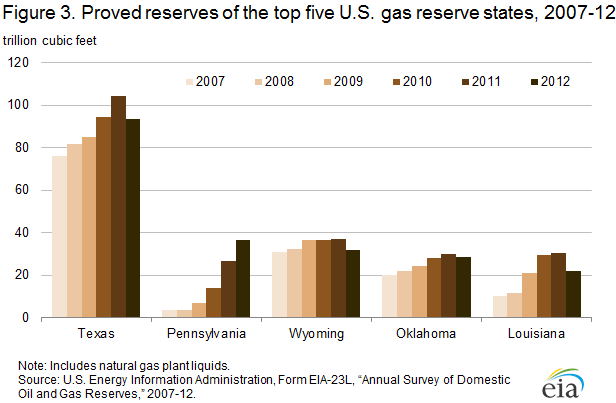 Pennsylvania is poised for some spectacular growth thanks to the Marcellus Shale, which has grown from just 2% of domestic gas supply in 2007 to nearly 20% at the end of 2013. Without the play, domestic production would have likely peaked in 2011 or 2012. In fact, production is expected to keep growing at least through 2015, despite the fact that wells experience an average 65% decline in volume over any three-year period. That helped Pennsylvania become the only state in the top five of proven wet natural gas reserves to see a positive increase in 2012, which helped it jump from fifth to second in the rankings, albeit a distant second.