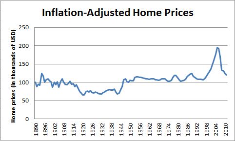 According to data from Robert Shiller in his book Irrational Exuberance, inflation-adjusted home price between 1890 and 1990 rose by a mere 0.21% per year. Between 1950 and 1997 the return shrank even more, to just 0.08% per year.