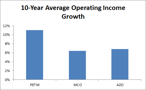 A company's ability to generate high returns on investment is useful insofar as it can continue to invest at high rates of return. Fortunately, all three companies have growth opportunities. PetSmart has experienced the highest rate of growth over the last ten years, followed by AutoZone and Moody's. Although past rates of growth are higher than these companies are likely to generate going forward, each can consistently grow earnings per share for years into the future.