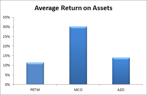 High profitability is the most crucial aspect of high-return companies. Generally speaking, a company is highly profitable if it generates a double-digit return on capital employed in the business. Moody's, AutoZone, and PetSmart each generate double-digit returns on assets. This means that for every dollar of shareholder capital reinvested in the business, these companies generate at least $0.10 in annual profit.