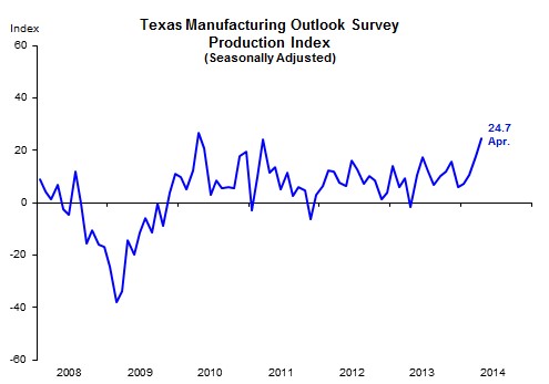 The monthly survey asks about 100 Texas manufacturers to rate their views on current and future business activity. Market watchers keep a close eye on this index, as Texas' manufacturing can serve as an important indicator of national economic health. A positive number indicates month over month growth, while a negative number means contraction. April marks the 12th straight month of activity increase for the Lonestar State .