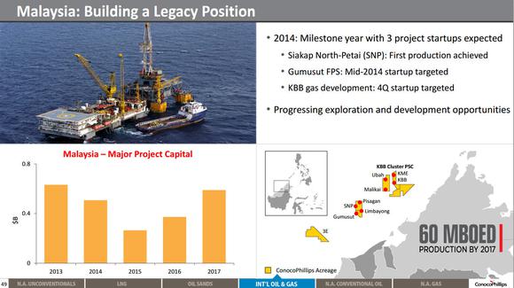While Malaysia isn't well known for its energy production, that's starting to change with each new find. Oil and gas from the region is very high margin thanks to its close proximity to Asian markets, which is why companies like ConocoPhillips are bringing so many new projects online over the next year. As the below slide notes, ConocoPhillips is building an important legacy position in Malaysia.
