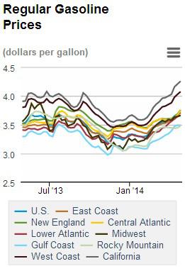 The national average price for regular gasoline clocked in at $3.713 per gallon Monday, up $0.030 from a week ago and $0.193 above the same time last year. West Coast prices made the biggest $0.046 leap, while Gulf Coast prices remained at week-ago levels.