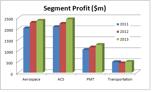 However, a quick look at Honeywell's segmental profits for 2013 suggests that its main upside potential lies from an improvement in either its aerospace segment, or even, its automation and control solutions, or ACS, segment. For reference, the acronym for the performance materials and technologies segment is PMT.