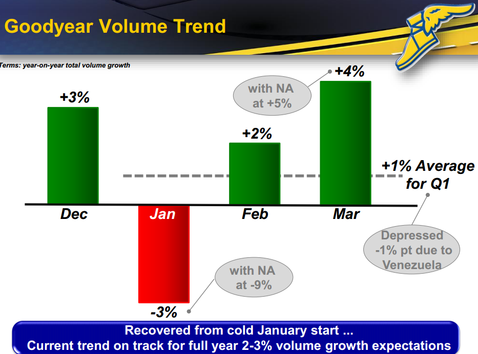 To the second question, this does appear to merely be a speed bump for Goodyear. While January weather negatively affected OEM production and sales, as well as retailer traffic, Goodyear's business rebounded sharply in the following two months. Furthermore, there's absolutely no reason to expect significant charges from Venezuela to recur.