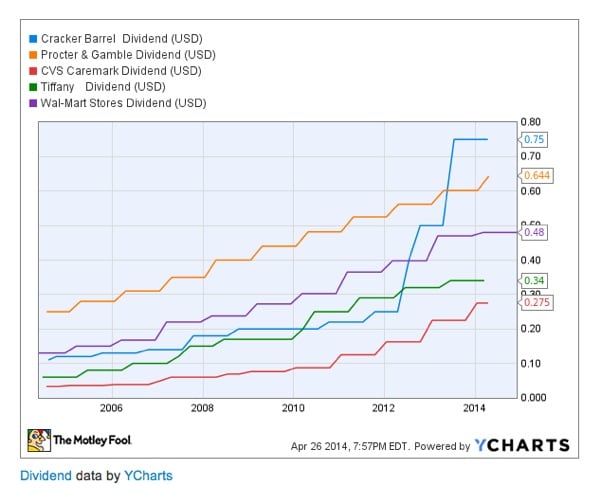 It pays to invest in shareholder-friendly companies. After all, as a shareholder you are the management team's business partner. One of the most fundamental measures of a company's management shareholder friendliness is their commitment to the dividend. In this article, we'll look at five companies with different business models--Cracker Barrel (CBRL +0.38%), Procter & Gamble (PG 0.06%), CVS Caremark (CVS +0.63%), Tiffany (TIF +0.00%), and Wal-Mart Stores (WMT +1.29%). What they all have in common is an excellent track record of dividend growth, which we will see is an important ingredient in long term total returns.