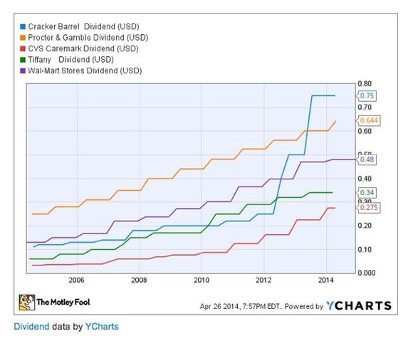 It pays to invest in shareholder-friendly companies. After all, as a shareholder you are the management team's business partner. One of the most fundamental measures of a company's management shareholder friendliness is their commitment to the dividend. In this article, we'll look at five companies with different business models--Cracker Barrel (CBRL +1.64%), Procter & Gamble (PG 0.20%), CVS Caremark (CVS +0.55%), Tiffany (TIF +0.00%), and Wal-Mart Stores (WMT +0.57%). What they all have in common is an excellent track record of dividend growth, which we will see is an important ingredient in long term total returns.