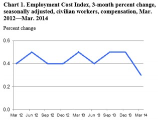 After increasing 0.5% for fourth-quarter 2013, this quarter's civilian workers employment costs edged up just 0.3%. Analysts had expected another 0.5% rise. Employment cost increases have only dipped to 0.3% twice before: first-quarter 2009 and once for third-quarter 2011. Civilian workers include private industry employees, as well as state and local government civil servants.