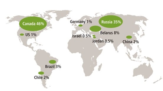 Other countries total 1%. Source: PotashCorp. Data source: US Geological Service