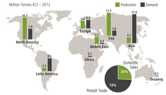 While the first graph is self explanatory, the second graph shows how major potash-consuming markets like Asia and Latin America rely heavily on imports to fulfill their nutrient requirements. The small pie chart further indicates how three-quarters of the global potash produced is traded.