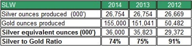 The company has increased its gold operations in the past year mainly after purchasing streaming rights from the Salobo and Sudbury mines back at the beginning of 2013. The table below shows the changes in the amount of gold, silver and silver equivalent ounces produced.