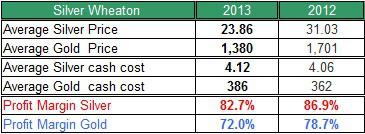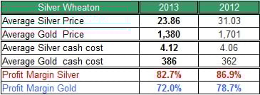 The rise in Silver Wheaton's gold operations has cut down the company's operating profitability. Even though both gold and silver prices tumbled down during 2013, the profitability of silver remained above gold's.