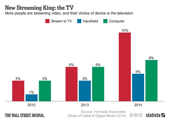 While people watching streaming video had been evenly split between television and computers in 2012 and 2013 (with people watching on handheld devices a distant third), TV has become the overwhelming choice. And the overall number of people watching streaming content at all has increased, as the chart below shows.