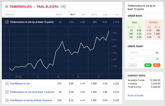 For example, the user in the image above is betting on the outcome of an NBA game between the Timberwolves and Trail Blazers. Player performance stocks -- questions like Will Mike Trout hit a home run today? or Will LeBron James score at least 30 points tonight? -- will also be an avenue for investors. Best of all, though, users can change their minds -- by buying or selling stock -- in the middle of a game.