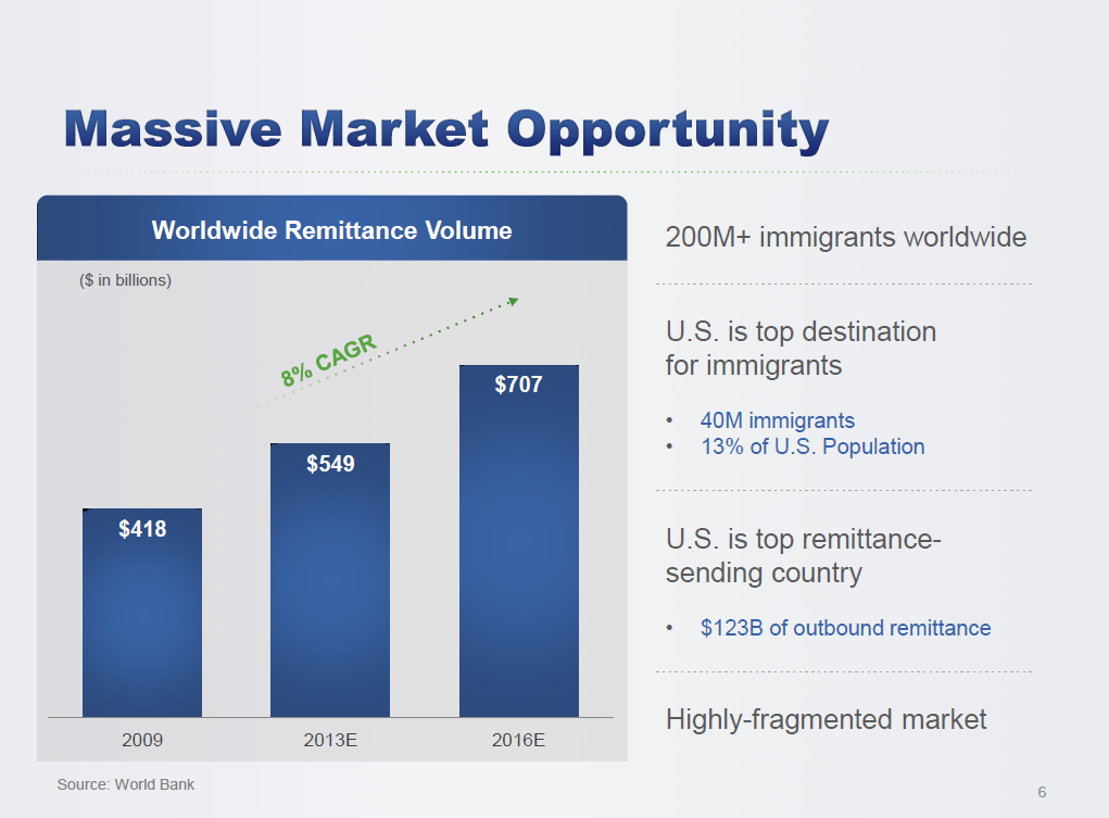 To be sure, Xoom faces a slew of competition vying for a piece of a tremendous global remittance market. But the company has done a great job of growing a loyal customer base in a short amount of time and as it continues to grow by adding new markets as well as ancillary services, this is a growth story that investors to which investors will want to pay attention.