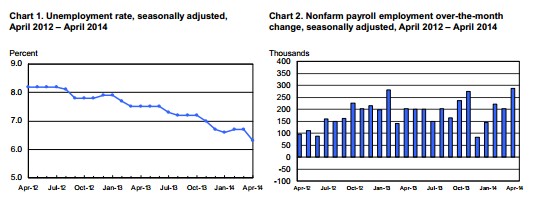 But employment additions alone don't tell the full story. The unemployment rate fell sharply from 6.7% in March to 6.3% in April, also well below expectations of 6.6%. However, much of the rate decrease came from a sizable 806,000 drop in labor force participation.