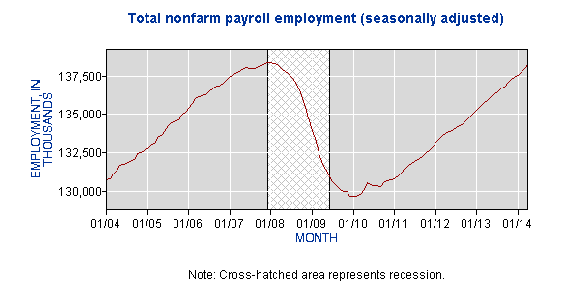 A more direct comparison of nonfarm payrolls on a constant labor force participation basis shows that the 138.25 million working people from April 2014 matches up almost identically with the 138.28 million from May 2008. To put this into even easier-to-understand terms, the nonfarm labor force hasn't grown in six years.