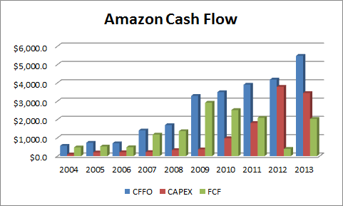 So the numbers that long-term Amazon bulls want to focus on are operating cash flow and free cash flow (defined as operating cash flow minus capital expenditures). Here's how those numbers have stacked up over the past decade: