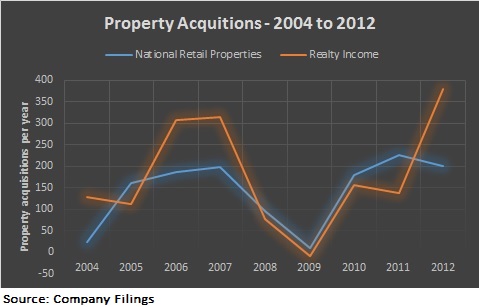 Realty Income and National Retail fund property purchases through selling new shares of stock or borrowing money by issuing notes and bonds. Of the two, borrowing money is certainly linked with interest rates. If lower interest rates favor the borrower, we'd expect to see property acquisition increase more when rates are low, as compared to a higher interest rate environment.