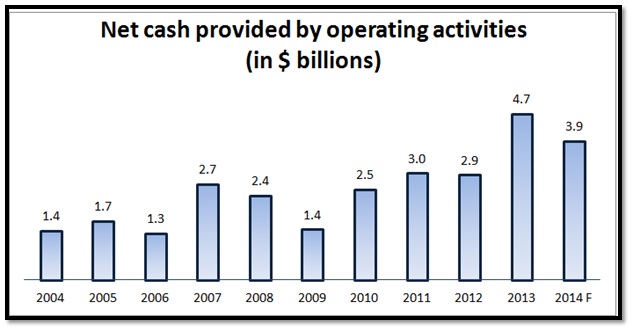In the past decade, Deere has generated nearly $24 billion cash from operations, the consistency being greater in recent years. Last year was an excellent one for the U.S. ag sector, and Deere lapped up the opportunity. It increased domestic ag equipment sales by 5% to $2.2 billion, while companywide sales went up 5% to $3.8 billion and earnings surged by 15% to $3.5 billion. Cash from operations touched a record high of $4.7 billion.