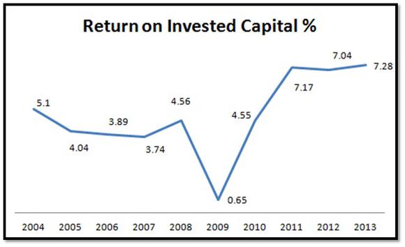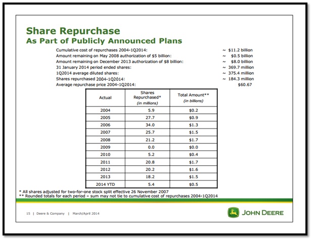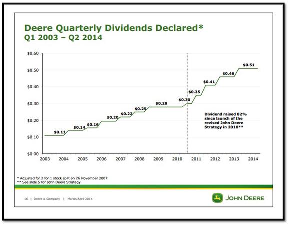By its own admission, returning cash to shareholders is one of Deere's key priorities. The company's done a good job of it so far. Deere has regularly increased its dividend, with its annual dividend increasing from $0.53 per share in 2004 to $1.99 per share in 2013. While the quantum of increase has varied each year depending on profits earned, the company has ensured that the growth remained above the inflation rate. The current payout ratio is a comfortable 28.2%. Management wants to keep the dividend payout within the range of 25-35% of its mid-cycle earnings.