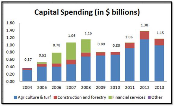 These results are the fallout of the operating discipline that Deere has maintained over the years. In its March/April presentation, the company provided some excellent numbers to vouch for this. Deere has reduced its working capital requirement by $8.5 billion in fiscal 2013 from 1998 levels. It's also maintained its trade receivables at approximately the 1998 levels despite tripling sales.