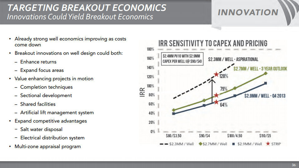 At the company's investor and analyst meeting back in March, management spoke about wanting to get well costs down to $2.7 million per well over the next three years. That would improve its internal rate of return from 64% at $90 oil and $4 gas to 79%. However, as the following slide shows SandRidge Energy isn't looking to stop there as its aspirational goal is to get its well costs down to $2.3 million per well, which would push its returns to 128%.
