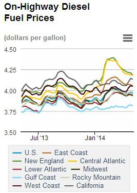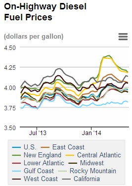 For the same period, average retail diesel prices fell $0.011 for a national average of $3.964 per gallon. On a regional basis, Midwest prices also made the deepest $0.012 dip, while Rocky Mountain prices eased down just $0.004 per gallon.