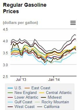 Retail regular gasoline prices clocked in at a national average of $3.684 per gallon for May 5, $0.029 below last week's price tag. Midwest prices dropped the most by far ($0.067), while the Rocky Mountain region saw a $0.019 increase in gas prices. The West Coast is the only region averaging more than $4 per gallon of gas in the most recent week.