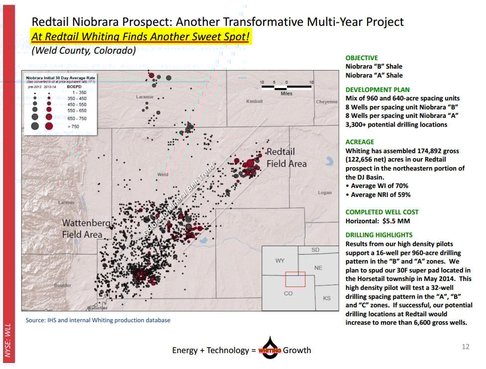 Of the four plays the Niobrara is likely the one most well known to investors. Bakken focused drillers like Whiting Petroleum (WLL +0.00%) have turned to that play to fuel the next phase of production growth. Whiting Petroleum recently experienced tremendous production growth out of its Redtail Niobrara asset as production surged 41% over the prior quarter. That growth should continues well into the future as company sees the potential for up to 6,600 future wells on its 174,892 gross acreage position as the following slide details.