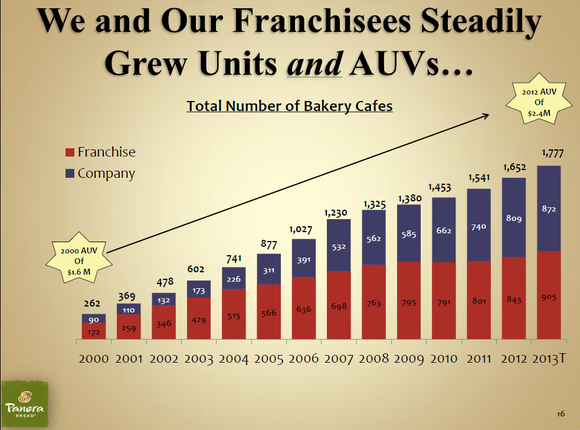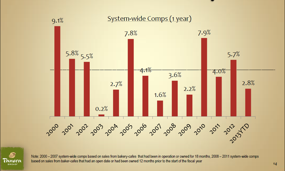 Over the coming quarters, investors are going to want to pay attention to same-store sales, plain and simple. Because Panera both owns and franchises stores, it will be worth paying attention to both numbers and making sure that any major disparities are accounted for and understood. But the total systemwide comps number will be very telling over the coming quarters, as it will tell us whether the stores are witnessing traffic and Panera 2.0 is producing tangible results. The slides below from a recent investor presentation show the breakdown in company-owned stores versus franchises, along with historical same-store sales for both: