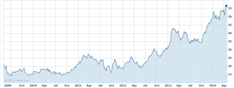 Valero Energy Corporation (VLO 0.46%) continues to trade near its 52-week high following its impressive earnings for the first quarter of 2014. Valero, which is the largest U.S. oil refiner, posted a 27% year-on-year increase in quarterly profit to $838 million, or $1.54 a share. This was its best first-quarter per-share profit since 2007. This performance shored up its share price, allowing it to maintain the gains it has made over the past several years. Over the last five years, shares of Valero have gained over 160%. The chart below is testimonial to this assertion.