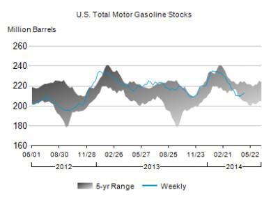 While oil supplies shrank, gasoline inventories expanded 1.6 million barrels (0.8%), the same amount as the week before. Demand for motor gasoline over the last four-week period is up a seasonally adjusted 1.4%. In the last year, supplies have shrunk 0.9%.
