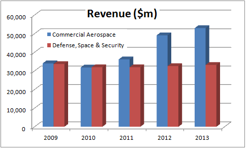 Furthermore, a quick look at how Boeing's segmental revenue has evolved over the last five years demonstrates the underlying dynamics very well. Defense based spending is flat, but commercial aerospace has enjoyed a cyclical recovery.