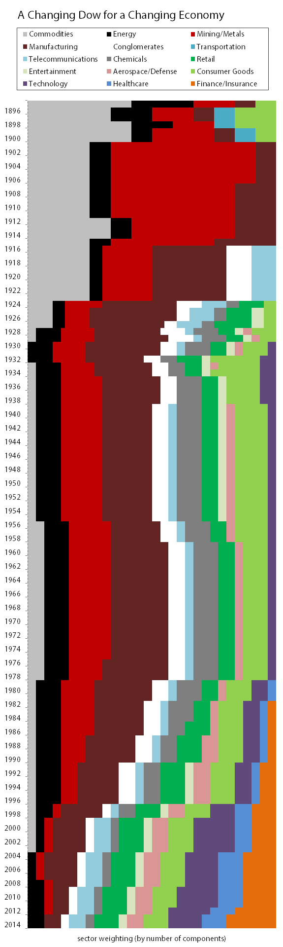 Over the decades, the Dow has made nearly 50 changes to its makeup in an effort to maintain a reasonably accurate representation of the American economy. A number of companies have come and gone (and occasionally come back again), leaving a historical record that offers some interesting glimpses into what really matters to the American economy, at least through the prism of this one closely followed index. I've put together a graphical representation of these changes, from 1896 to the present, to help you better understand how the Dow -- and the American economy -- has evolved over time.