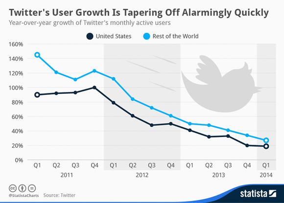 At first sight, these numbers look good. But the truth is that Twitter's growth is slowing down alarmingly quickly. Twitter's user base grew at a 44% rate in the second quarter of 2013. In the third and fourth quarter of the same fiscal year, the company's user base grew 39% and 30%, respectively. In this context, a 25% growth rate is quite worrying.