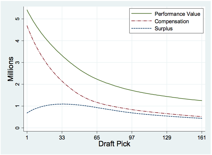 Figure III. Massey and Thaler, 2012. Worth noting is that the surplus curve is always positive in the graph above. This indicates the NFL's rookie wage scale allows teams to pay first-year players less than their eventual performance dictates they deserve. *First image (above initial text) via Marianne O'Leary, Flickr.