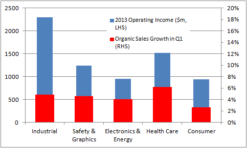 First, its strongest profit centers (industrial, safety and graphics, and health care) continue to outperform its other segments. In order to demonstrate this point, I've broken out the organic sales growth in the first quarter (the red bars) and superimposed them on the full-year operating income figures.
