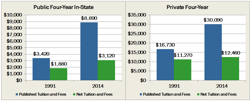 In 1991 a student could expect to pay more than half of the published tuition at public schools. Today, that stands at just 35%. While many talk about the rising costs, few mention the rising benefits of financial aid, which has helped reduce the impact of the increased prices.