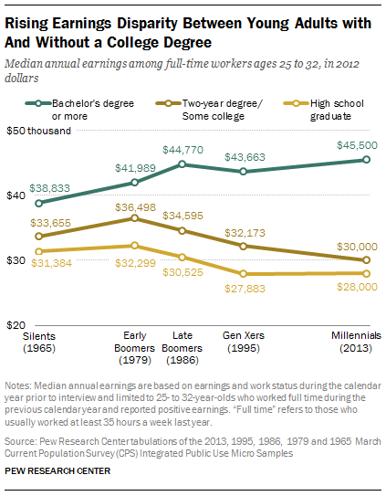 Secondly, Pew Research Center found in its study "The Rising Cost of Not Going to College" that the gap between what someone earns with a college degree versus someone without one has only widened over the years
