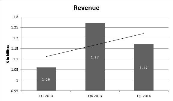 Juniper posted a revenue of $1.17billion in the first quarter of 2014, which translates to a 10% year-over-year (Y/Y) revenue growth; Wall Street revenue estimate was $1.15 billion. This revenue growth was the result of the company's penetration in data centers through its family of switches. Routing also grew by 7% on a Y/Y basis. The point to note is that Cisco is a major player in this market and Juniper's ability to capture the share from Cisco indicates that it has a competitive line of products.