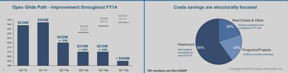 - Cost and capital restructuring efforts will help the stock to rally in 2015. The company is trying to reduce its OPEX to less than $500 million by the first quarter of 2015 and is targeting a 25% operating margin by the same period. Juniper's planned restructuring includes a 6% personnel reduction, consolidation of the Sunnyvale campus and reducing R&D costs.