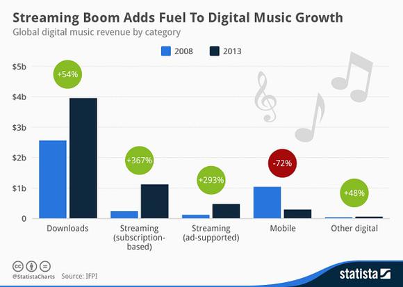Global digital music revenues reached an all-time high of $5.9 billion in 2013 as revenues from streaming services, both ad-supported (+17.6%) and subscription-based (+51.3%), saw strong growth that outweighed a slight decline in download sales (-2.1%), according to IFPI, a music business trade association. The chart below shows that over the past five years downloads are up by more than 50% but the 2013 dip suggests the rise of streaming services will eventually supplant the need for most people to actually own music.
