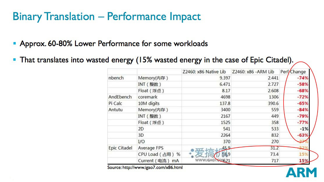 Rod Watt of ARM recently concluded that binary translation drains the CPU and battery resources by as much as 40% and 90%, respectively. This inefficient utilization of system resources can prove detrimental to Intel's growth in the cutthroat, ARM-based, mobile chip industry.
